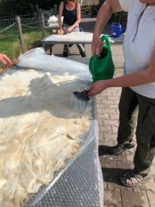 Je maakt een vegetarische, diervriendelijke vacht door een geschoren vacht op een wollen ondergrond te vilten. Het eindresultaat lijkt qua ondergrond weer op een schapenhuid, maar is dat niet, want het schaap leeft gewoon nog! Je kunt aan de vacht ook een andere vorm geven. Bij vachtvilten gebruik je alleen natuurlijke materialen en hulpmiddelen. We gebruiken water en zeep om de vacht te vilten; door dit met de hand te wrijven en te rollen hecht de vacht zich aan de onderlaag. Je gaat aan het einde van de workshop met een mooi gevilte schapenvacht naar huis: een uniek woonaccessoire voor op de bank, in een stoel of aan de wand!